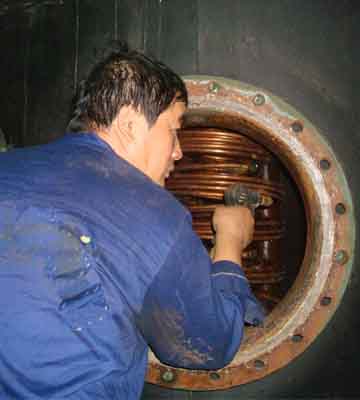 首先防空容積式換熱器罐內(nèi)的水,打開熱媒開關(guān),讓高溫?zé)崦街苯蛹訜峁艹蹋诩訜岬倪^程中,換熱金屬元件隨溫度升高發(fā)生膨脹,換熱元件外表面的垢層也會隨溫度的升高膨脹,金屬與水垢的膨脹系數(shù)不一致,在內(nèi)力的作用下垢層很容易被拉裂,過段時間再通入冷水,水垢在沖刷力的作用下輕易脫落,尤其是浮動盤管換熱管束效果顯著。